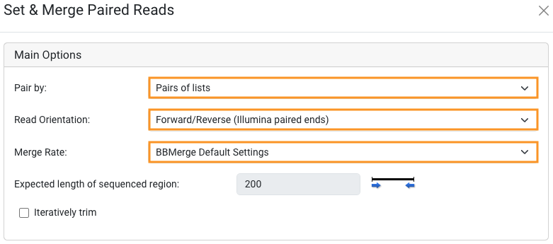 Assuming your i7 read file contains your indexing barcodes, select this sequence list and the merged reads sequence list from the above step. Select Pre-Processing > Set & Merge Paired Reads again, however this time choose to Set paired reads only. Adjust the Expected length of sequenced region to match your sequencing results.