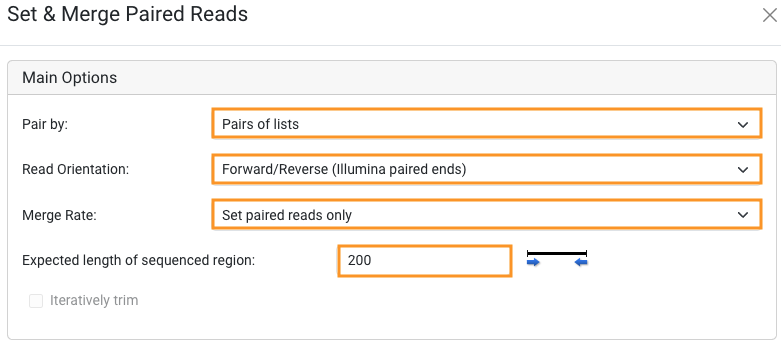Select the concatenated i5- i7 sequence list file and the merged reads sequence list file from the above step. Select Pre-Processing > Set & Merge Paired Reads again, however this time choose to Set paired reads only. Adjust the Expected length of sequenced region to match your sequencing results.