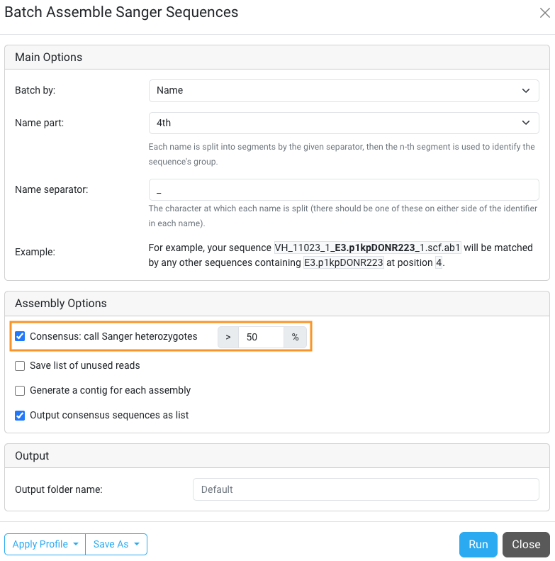 When a Sanger trace has an alternative peak that is at least as high as this percentage of the best peak, that sequence will contribute a heterozygous call to the consensus calculation. To change heterozygous bases in the consensus sequences, enter your preferred value in the Consensus: call Sanger heterozygotes option (the higher the percentage, the lower the chance of an ambiguous base being called).