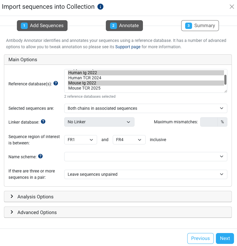 This step uses the Antibody Annotator pipeline to annotate the selected sequences as all sequences in a Collection are assumed to be annotated. Refer to the Antibody Annotator help article for this step.